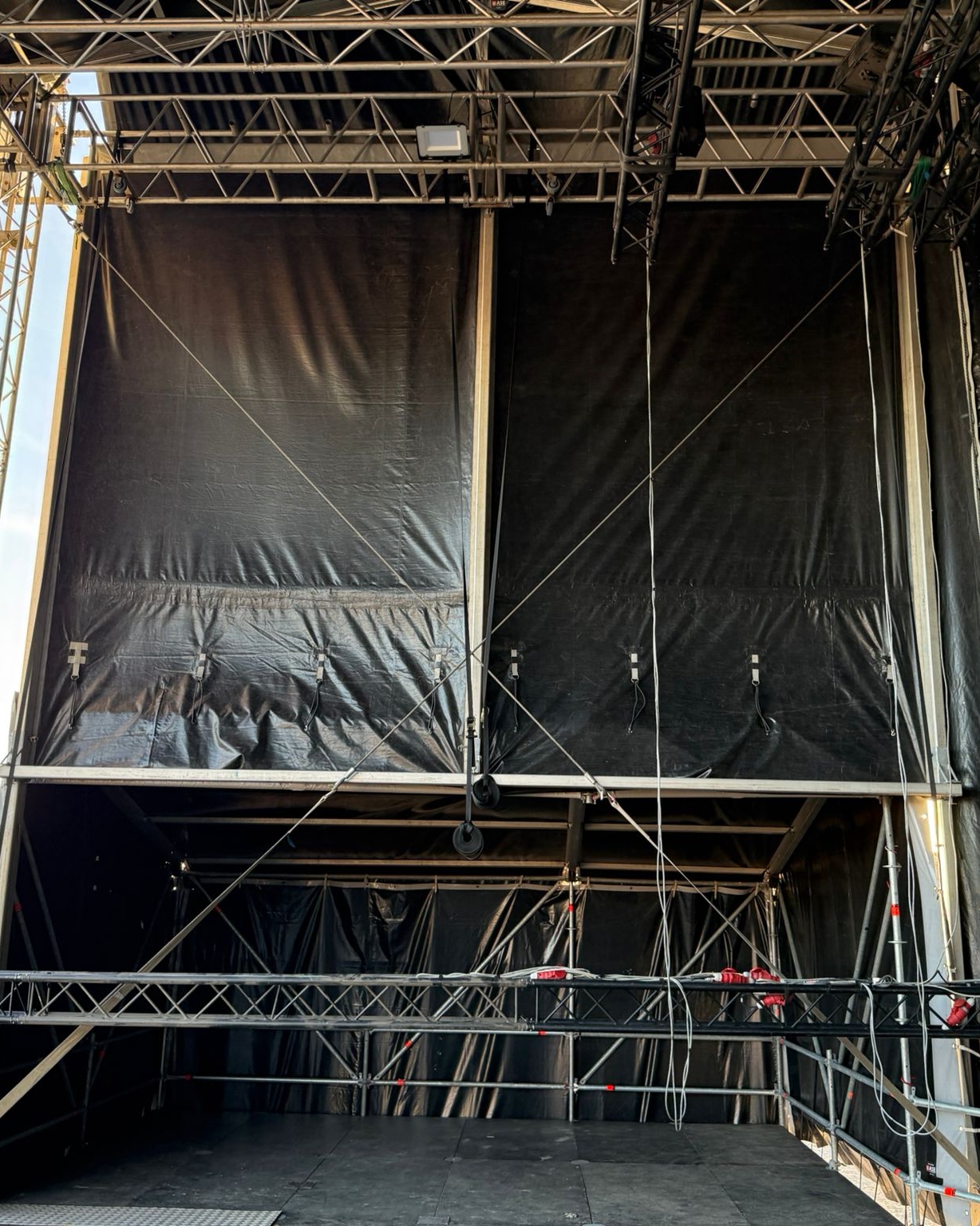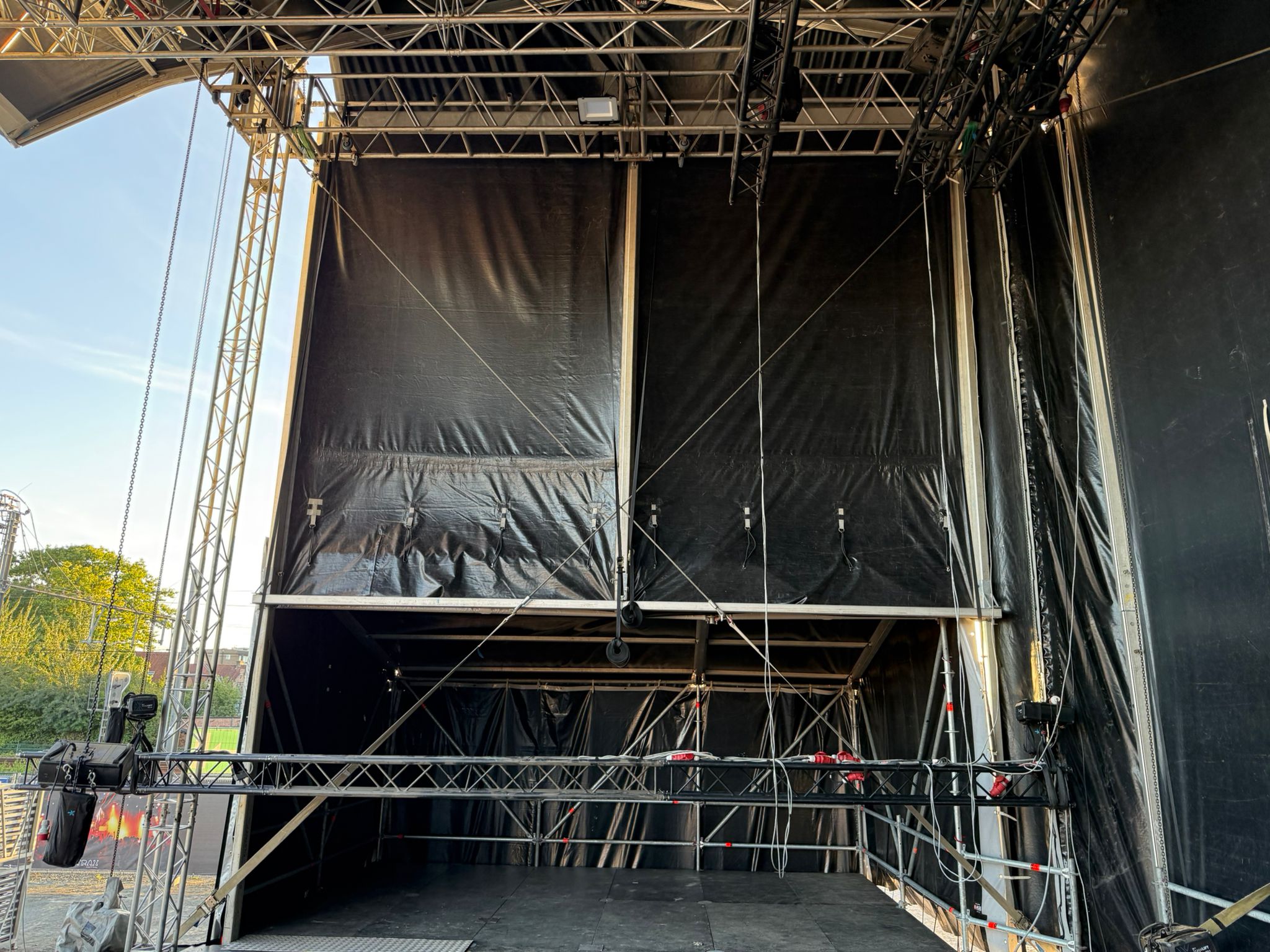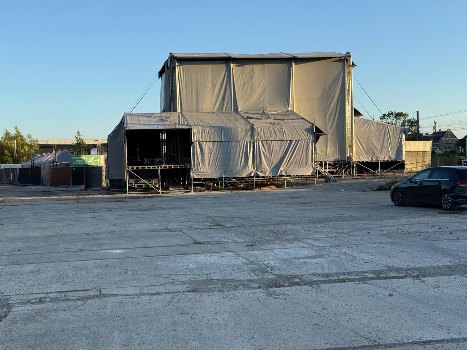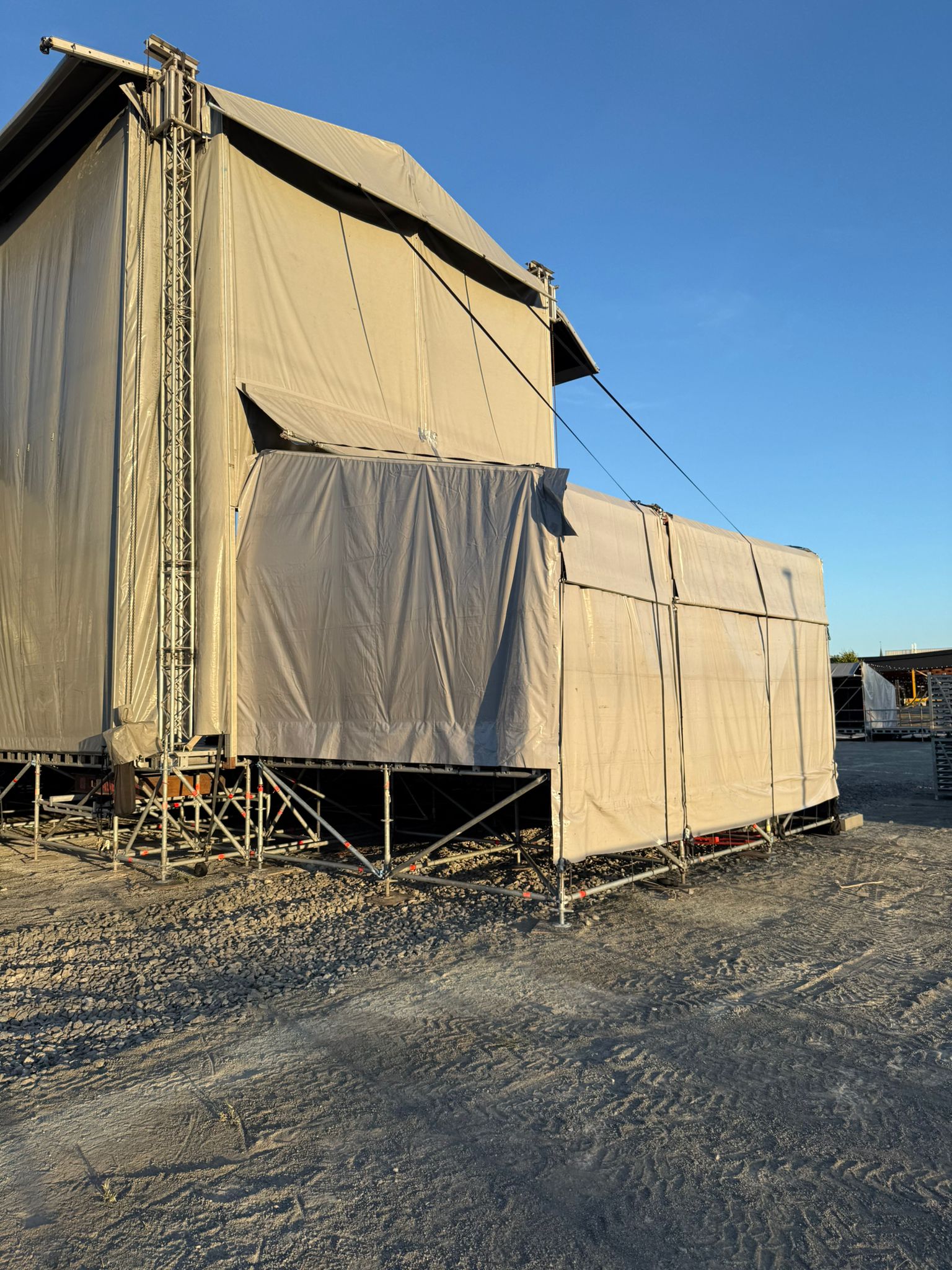 - Geïntegreerd: Bij overdekte podia maken back- en sidestages vaak deel uit van het ontwerp, met vaste afmetingen.