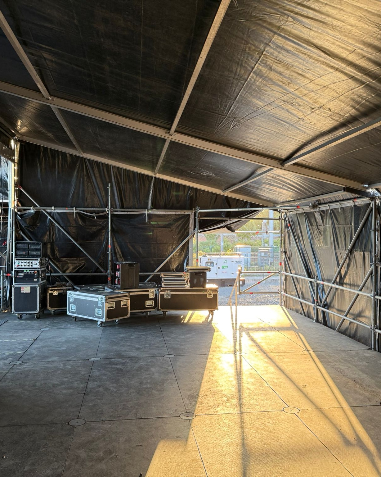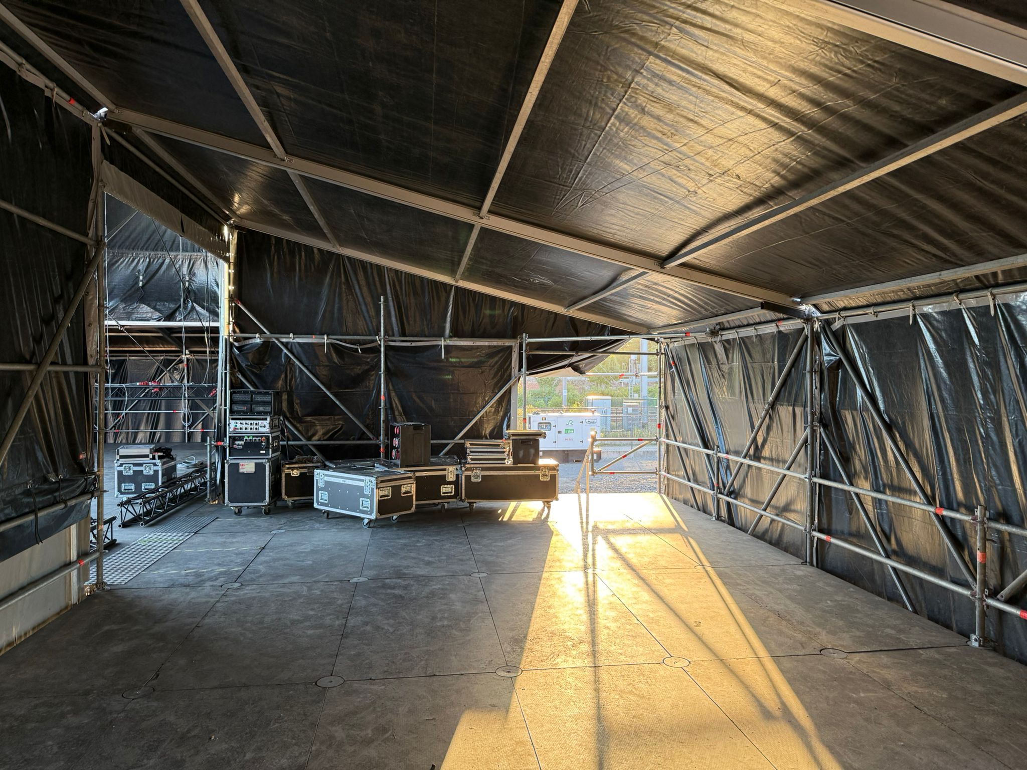 Gelegen achter het podium, perfect voor backstagewerk, technische ondersteuning of het stallen van materiaal.