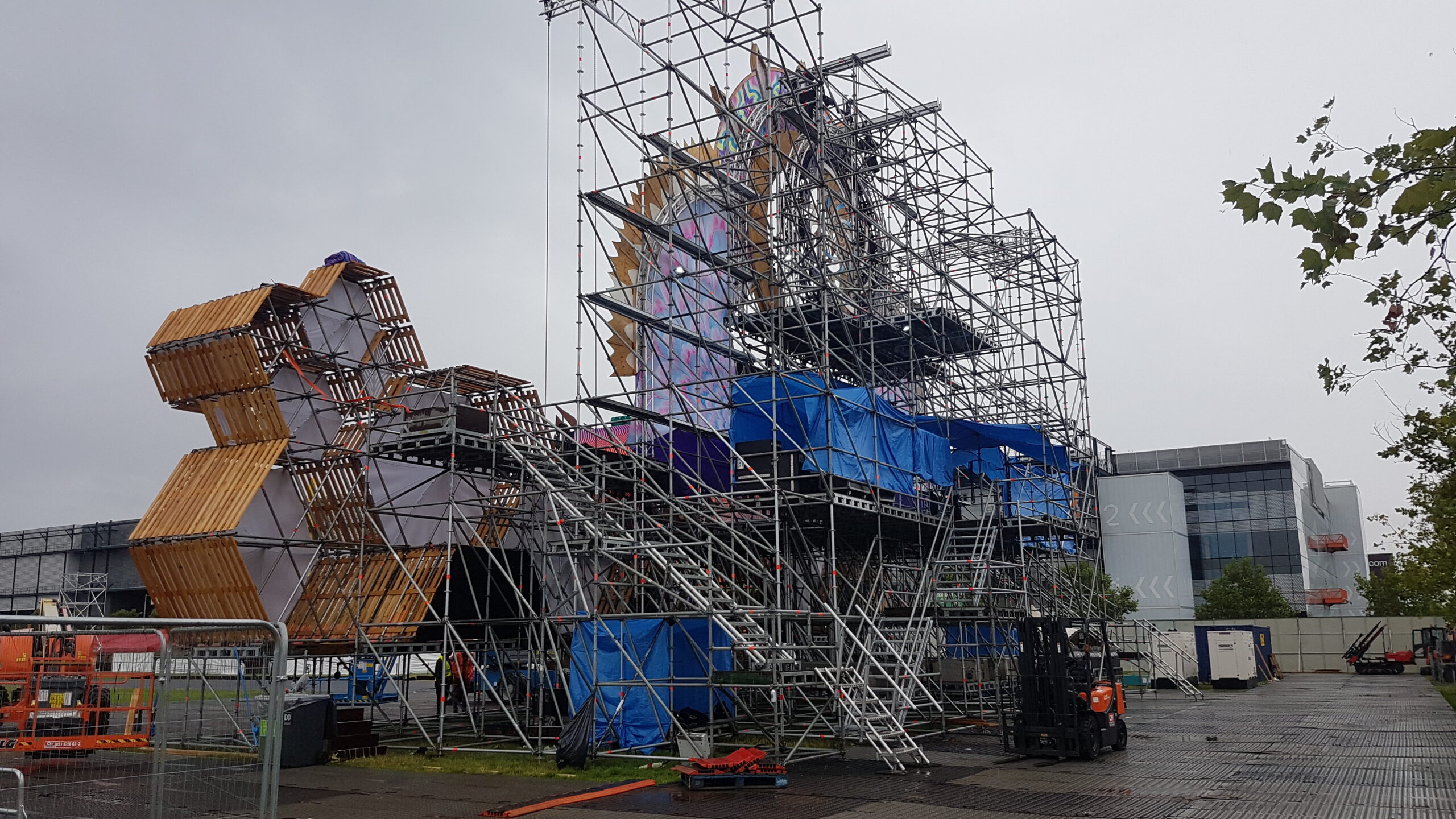 - Podium: Main stage: Steigerconstructie op maat volgens technische schetsen aangeleverd door Elrow