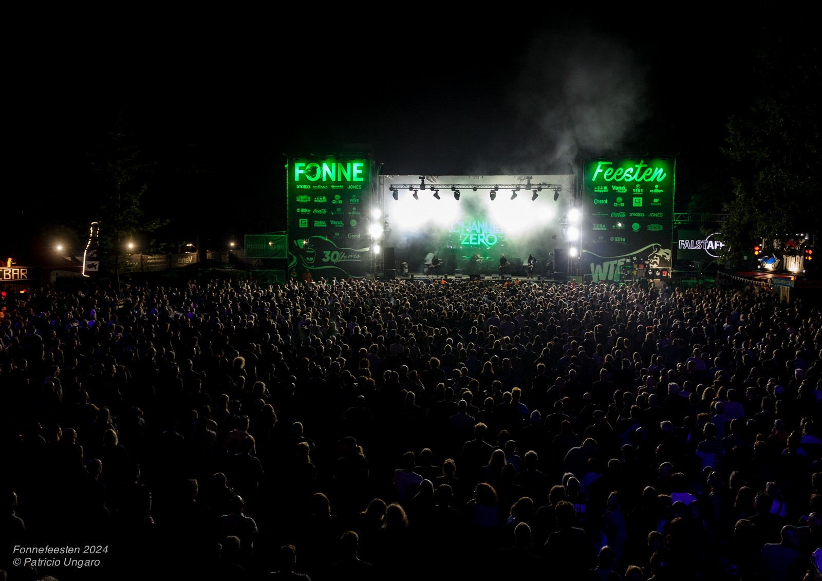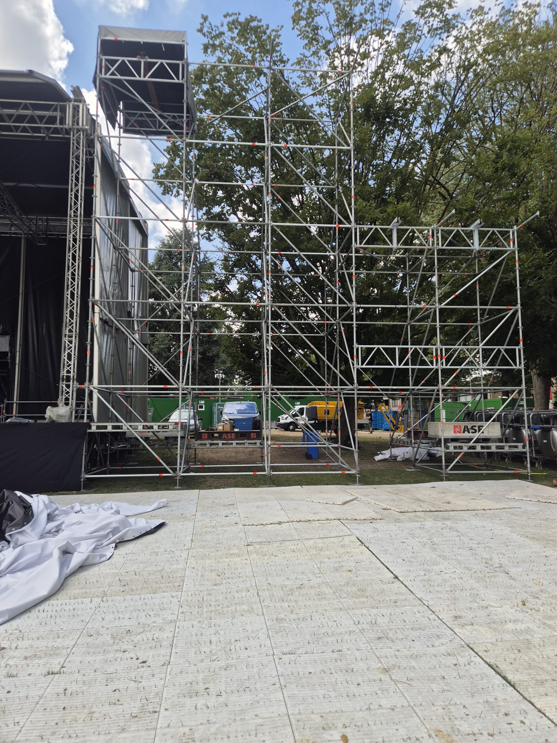 • Toebehoren: Front of House 4.14 x 4.14m in 2 verdiepingen, Toegangsbrug, Bannertoren, Steigerstructuren naast het podium voor Banners en Ledscherm