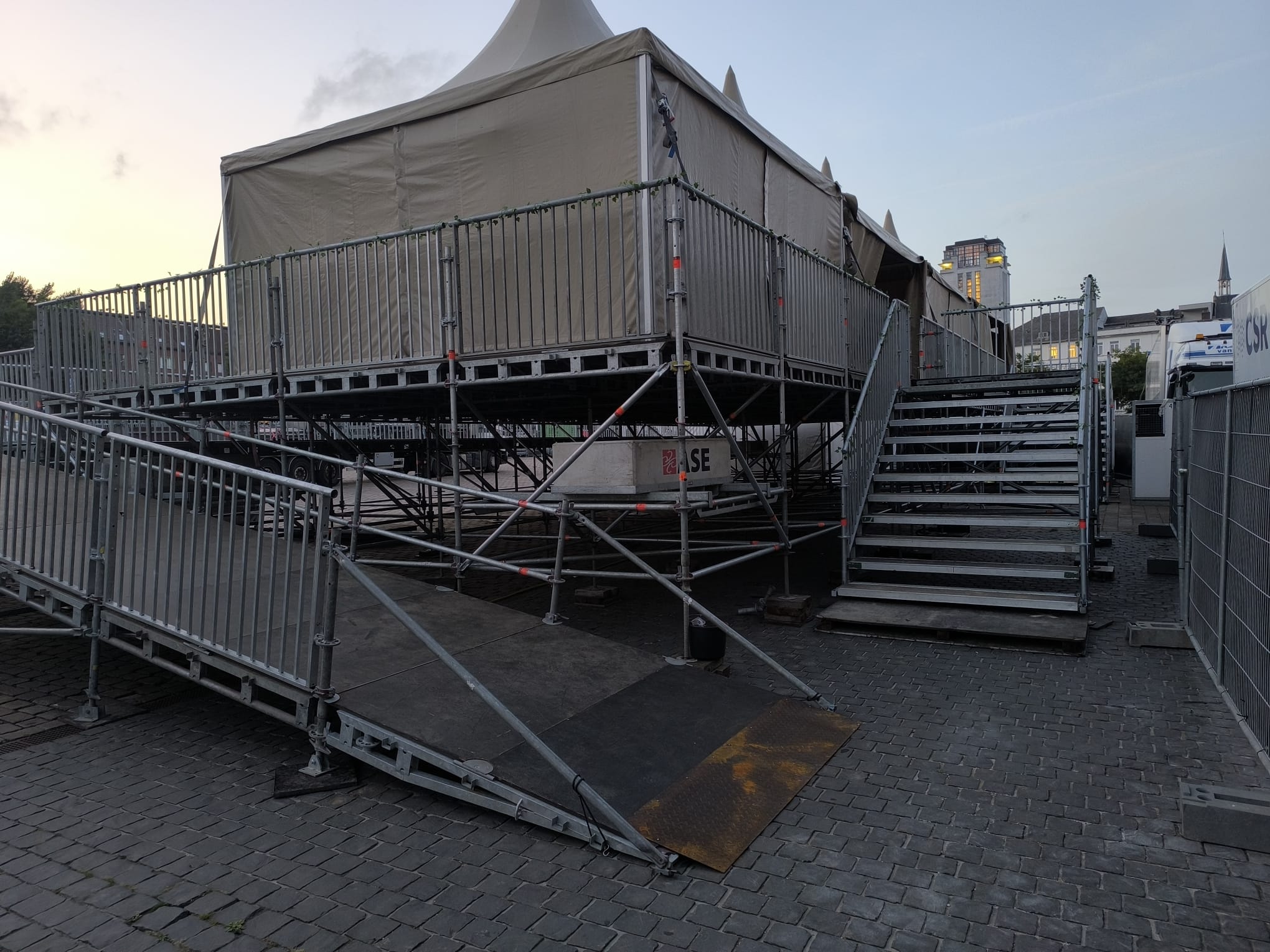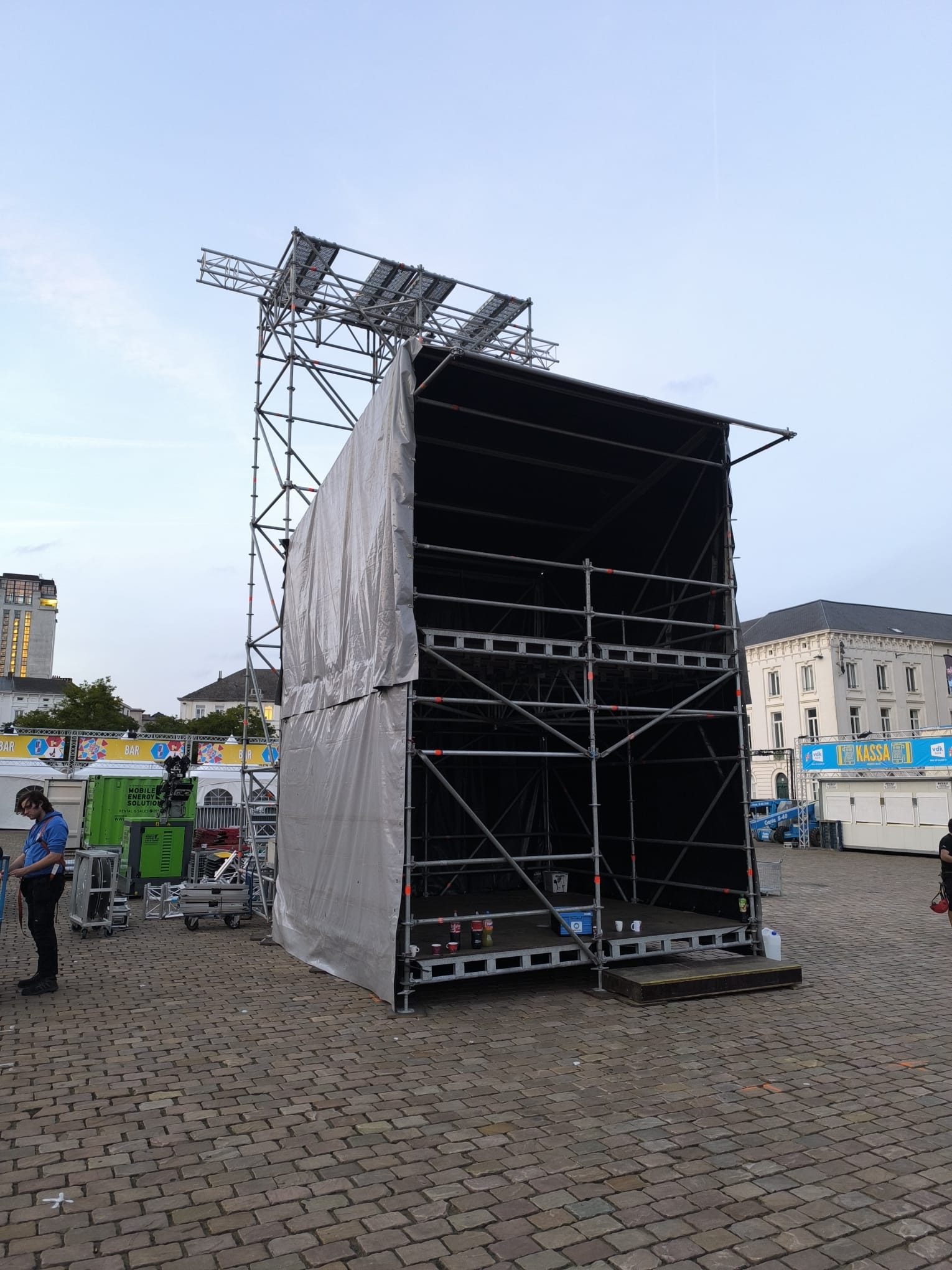 • Podium: GS350 in full version, met volledig geïntegreerde Backstage, Sidestages en Wing Groundsupport voor het ophangen van Ledschermen links en rechts van het podium.